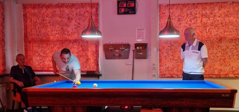 Op het biljart ontspon zich een heerlijk gevecht tussen de meester( Peter) en de leerling(Gijs). En wat hebben we als publiek kunnen genieten van een klasse partij!